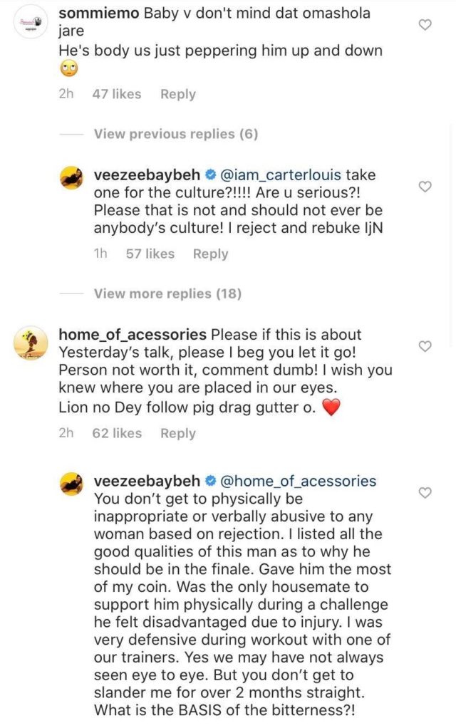 A user to tried to justify Omashola’s action replied to her, writing; “He’s not angry you said “NO” he questioned your loyalty to your team and betrayal. Don’t narrow it to gender context.. I’m Delta and also Urhobo, I supported you two but let’s be honest with instead of throwing sub.. then you came to the last Saturday night party and start telling him you are angry with him, now you are playing the NO card when you know the origin of the anger. It’s not about your NO but spitting him with the green Band.”