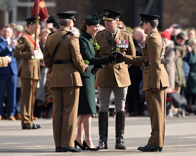 After which Kate follows a tradition which began with Queen Alexandra in 1901, to hand out shamrocks to officers and warrant officers. After the parade, which concludes with a march-past where the Duke took the salute, William and Kate then go on to enjoy a lunch with the officers and typically toast the day with some Guinness.