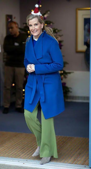 cobalt blue jumper and olive green trousers, we think Sophie’s Santa headband