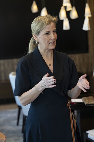 Sophie teamed her bottle green ensemble with a ‘Rose Cloudy Floral Silk’