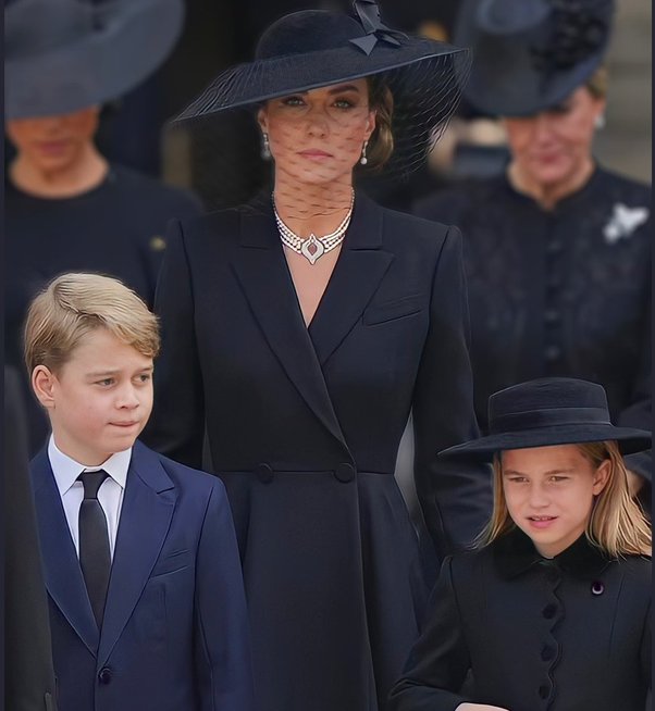 The Prince and Princess of Wales led George and Charlotte to stand behind the coffin at the end of their service, as they filed slowly out of the abbey.