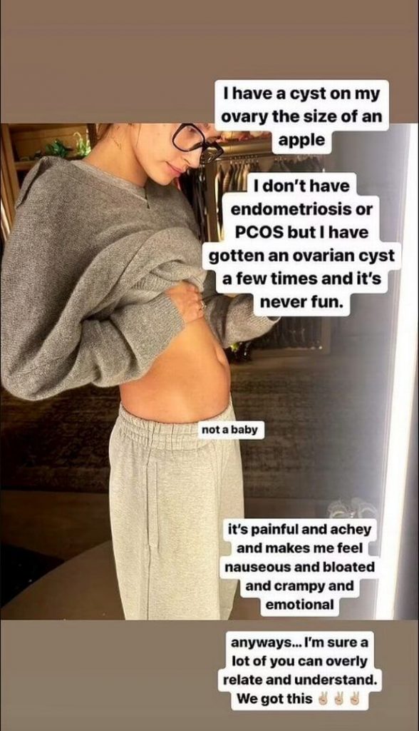 “I have a cyst on my ovary the size of an apple. I don’t have endometriosis or PCOS but I have gotten an ovarian cyst a few times and it’s never fun.”