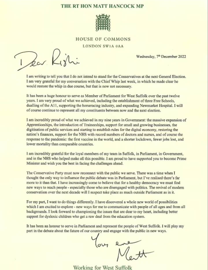Writing to Prime Minister Rishi Sunak, Mr Hancock said he had discovered a ‘whole new world of possibilities’ after escaping Westminister for a brief period and believes he can ‘influence the public debate’ away from Parliament.