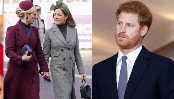 Princess Anne’s daughter Zara Tindall was seen enjoying friendly moments with her cousin Prince Harry’s former confidante Natalie Pinkham at Cheltenham on Tuesday.