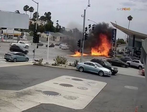 The car crashed into the roundabout, taking its front end into the air before it rolled onto its side and then roof. Around ten seconds later, it burst into flames.