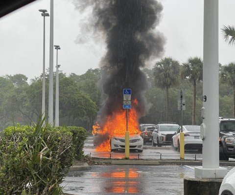 Video footage captured on a nearby Tesla car and shared by the City of Oviedo showed flames slowly consuming the car and breaking through a window.