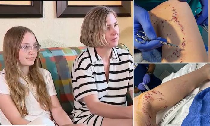 A pre-teen girl miraculously survived being bitten twice by a shark on a Florida beach and was left with 100 puncture wounds on her thigh that left her leg ‘dripping’ with blood.