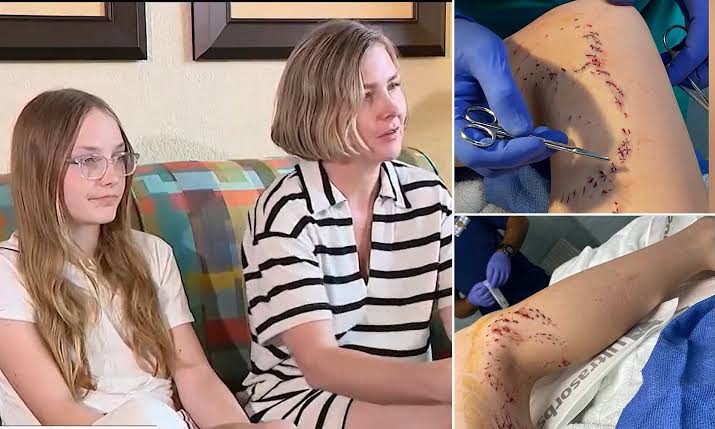When her father picked her up out of the water, her mother, Melissa Stallings, saw Woodhead’s leg dripping with blood and the girl was rushed to the hospital with ’75 to 100 [bite marks[ up and down her little thigh.’