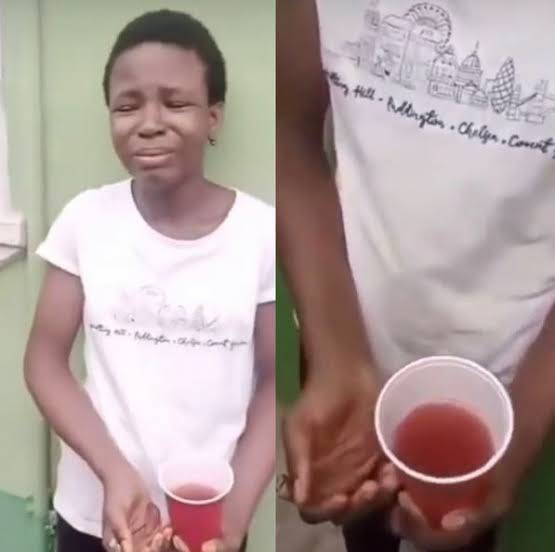 In the video, the maid who gave her name as Odiemena Faith from Abia state, could be seen holding a cup containing red liquid inside it.