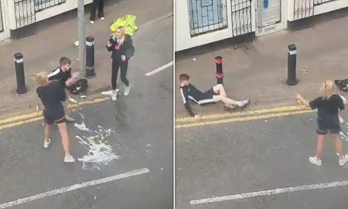 A young woman floored a guy with a huge right hook in a bizarre street fight outside a pub in broad daylight.