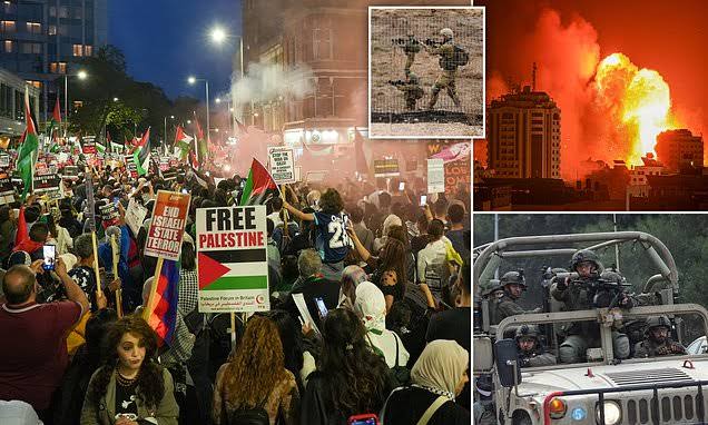 It comes after thousands of Palestinian supporters descended on the Israeli embassy in London, waving flags, singing, and setting off flares.