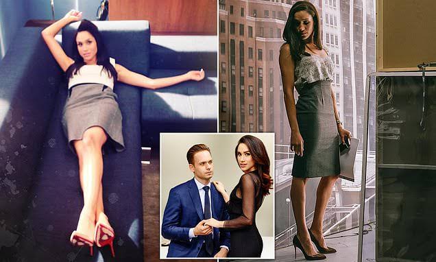 Another showed Prince Harry‘s wife lying on the floor with her bare feet resting on a cabinet alongside her co-star Sarah Rafferty.