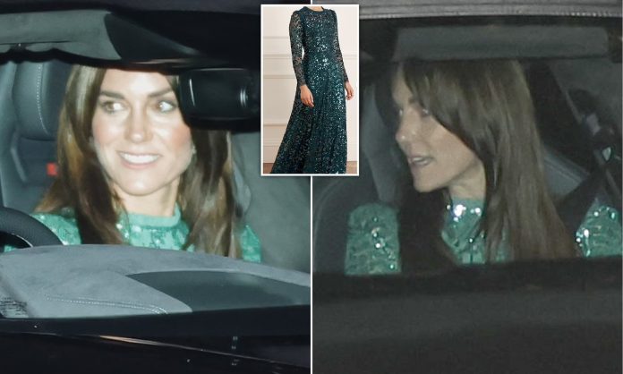 Kate looked dazzling in an emerald green, sequin-embellished dress from Needle & Thread, while William opted for a sleek black suit and white dress shirt.