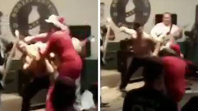 A guy in the crowd who was dressed as Kris Kringle didn’t like what he was hearing, and he rushed Kupers onstage, hopping up and starting to whoop on him.