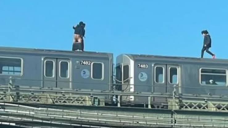 Two men were caught having sex on top of a moving 7 train in New York City, with the bare-bottom display becoming the latest shocking disregard for safety by subway surfers.