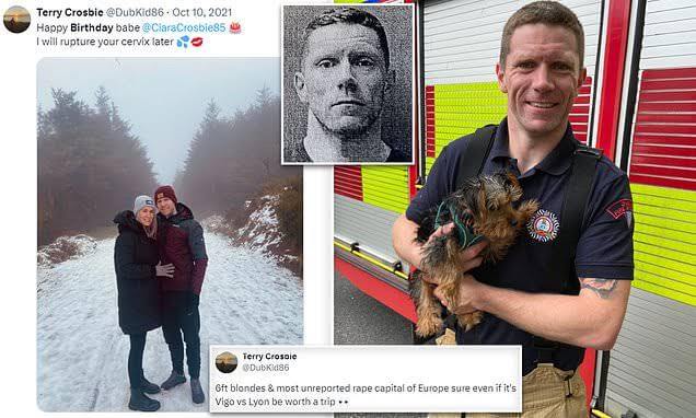 ‘Happy Birthday babe,’ Crosbie wrote on X on October 10, 2021. ‘I will rupture your cervix later.’