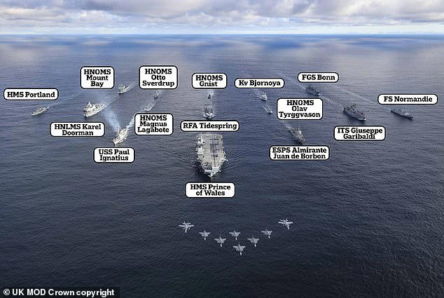 Pictured alongside 14 other vessels, the Royal Navy aircraft carrier, constructed at a cost of £3.5 billion, led the formation through exercises in the North Sea as part of the Nordic Response 24 drill.