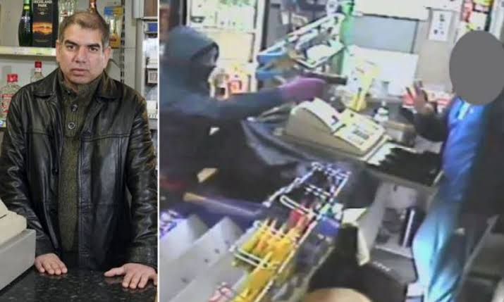 Three masked robbers charge into a Deepak Foodstore in Chilwell, Nottinghamshire, where they threatened an elderly shopkeeper with a gun and attempt to rip out the till before carting away with thousands of pounds worth of goods.