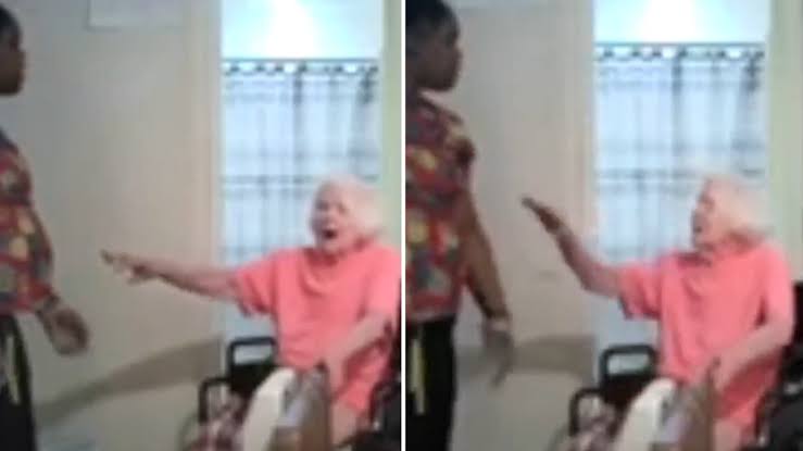 Arrington raises her fists and appears to threaten the patient as she towers above her wheelchair. The elderly woman is clearly distressed.