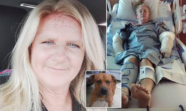 A Florida woman, 55, has revealed how she literally escaped death after she suffered a horror dog attack that left her arms and leg shredded by playing dead in a trench for hours.
