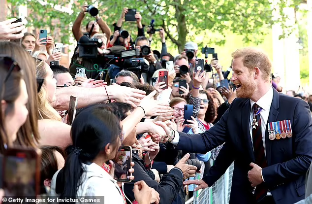 The Duke of Sussex greeted crowds as he departed St Paul’s Cathedral alone yesterday after attending a service to commemorate the 10th anniversary of the Invictus Games. Despite being met with cheers from well-wishers, he maintained a cheerful demeanor as he shook hands and interacted with hundreds of people who had gathered to greet him.