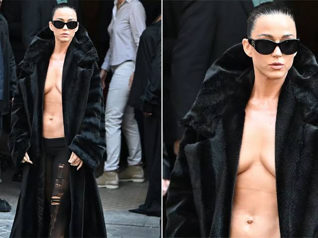 Katy Perry‘s arrival to the Balenciaga show in Paris on Wednesday surprised people as she wears nothing under a fur coat on … in a tights-as-pants look.