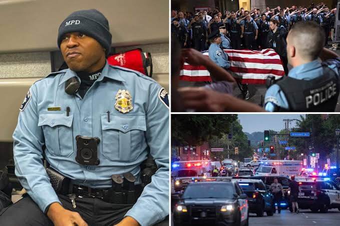 The body of the fallen officer was saluted as it was escorted to a waiting medical examiner’s vehicle outside Hennepin County Medical Center in Minneapolis shortly after the shooting on May 30, 2024.