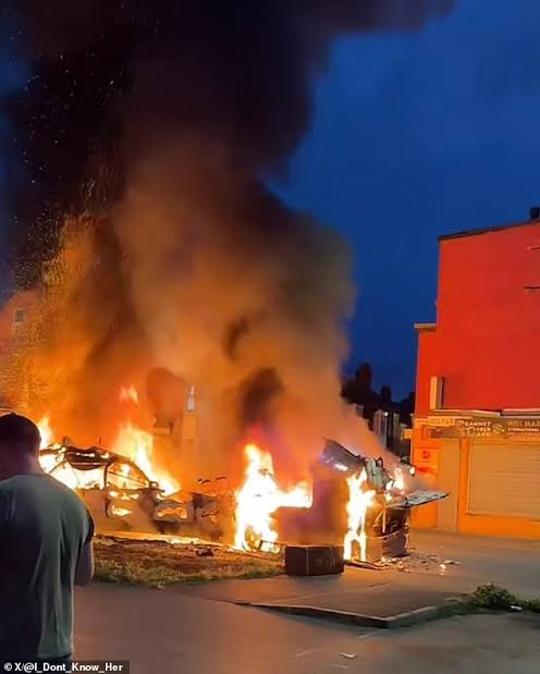 Locals were also seen running towards a fire started in the middle of the road with a large fridge, which they hurled onto the fire as locals cheered. Images later showed the double decker bus reduced to a charred and twisted wreck.