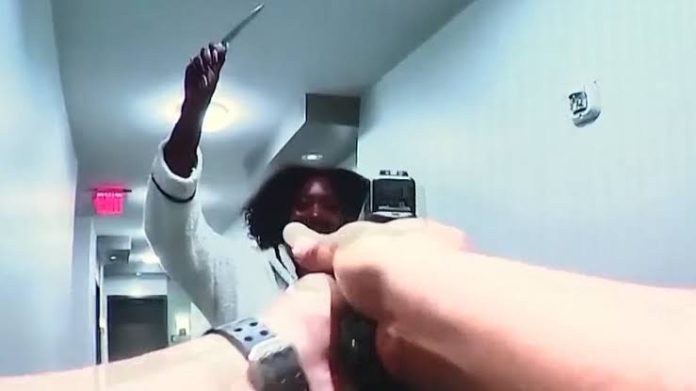 Police body camera video shows the moment a Virginia woman was shot dead by an officer after she charged him with a knife.