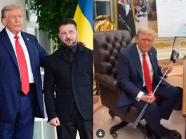 They shook hands. Harris, Biden’s vice president who Trump defeated, was not present nor was she mentioned.