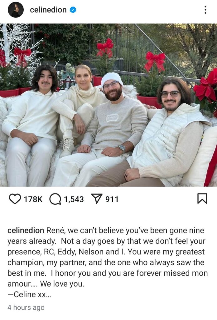 In the caption, she wrote: “René, we can’t believe you’ve been gone nine years already. Not a day goes by that we don’t feel your presence, RC, Eddy, Nelson, and I. You were my greatest champion, my partner, and the one who always saw the best in me. I honor you and you are forever missed, mon amour…. We love you. —Celine xx…”