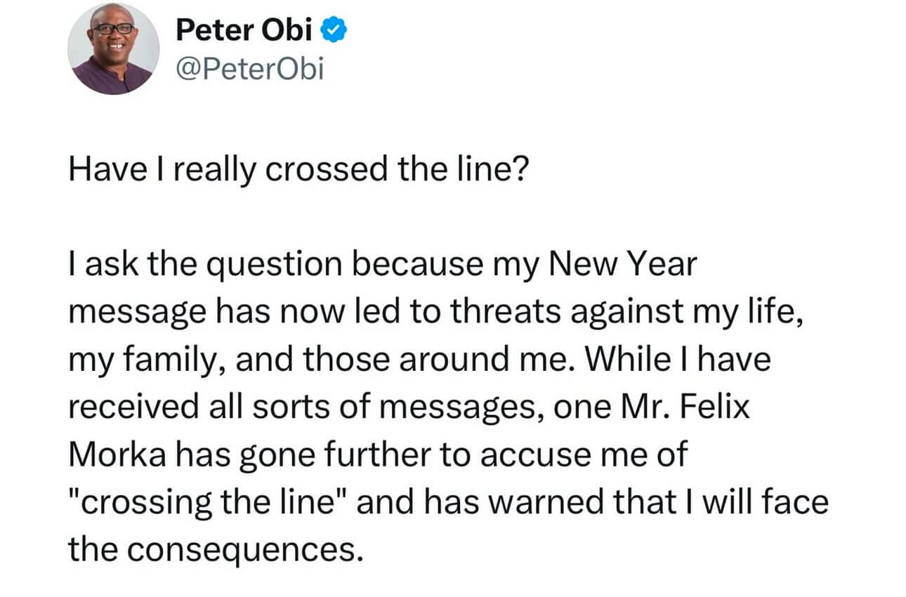“Have I truly crossed the line?” Obi asked, questioning what part of his New Year message would provoke such reactions. “My New Year message has now led to threats against my life, my family, and those around me. While I’ve received various messages, one Mr. Felix Morka has gone further to accuse me of ‘crossing the line’ and warned of consequences.”