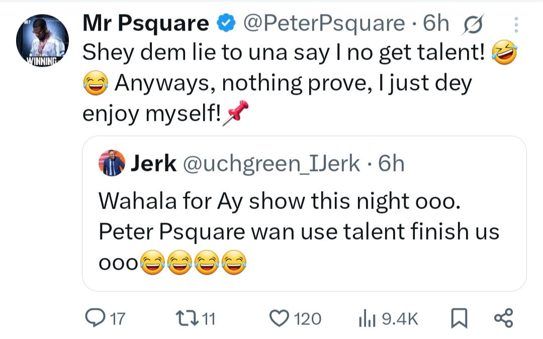 In response, Peter tweeted: “Shey dem lie to una say I no get talent! Anyways, nothing prove, I just dey enjoy myself.”
