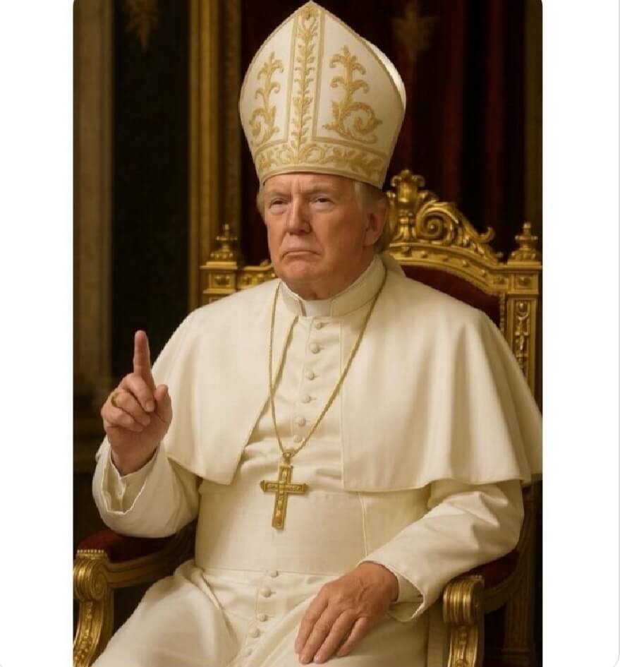 The AI-generated photo, later reposted by the White House’s official X account, shows Trump dressed in papal vestments and headdress, seated with a stern expression and his right finger raised in a blessing gesture.