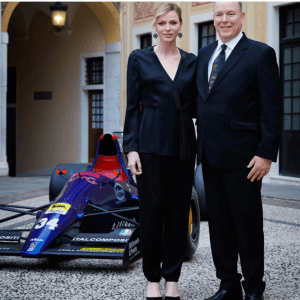 Prince Albert, 67, complemented his wife’s sleek look with a timeless black suit and tie. The pair posed together in front of a striking Formula 2 car, setting the tone for the weekend’s high-octane glamour.