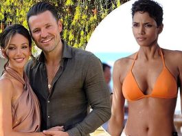 The 38-year-old actress looked gorgeous in a silky chocolate strapless dress as she pushed a pram carrying their daughter Palma – whom they welcomed in March.