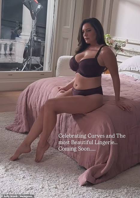 She posed in a stunning brown bra set and a grey two piece, writing: ‘Celebrating curves and the most beautiful lingerie. Coming soon.’