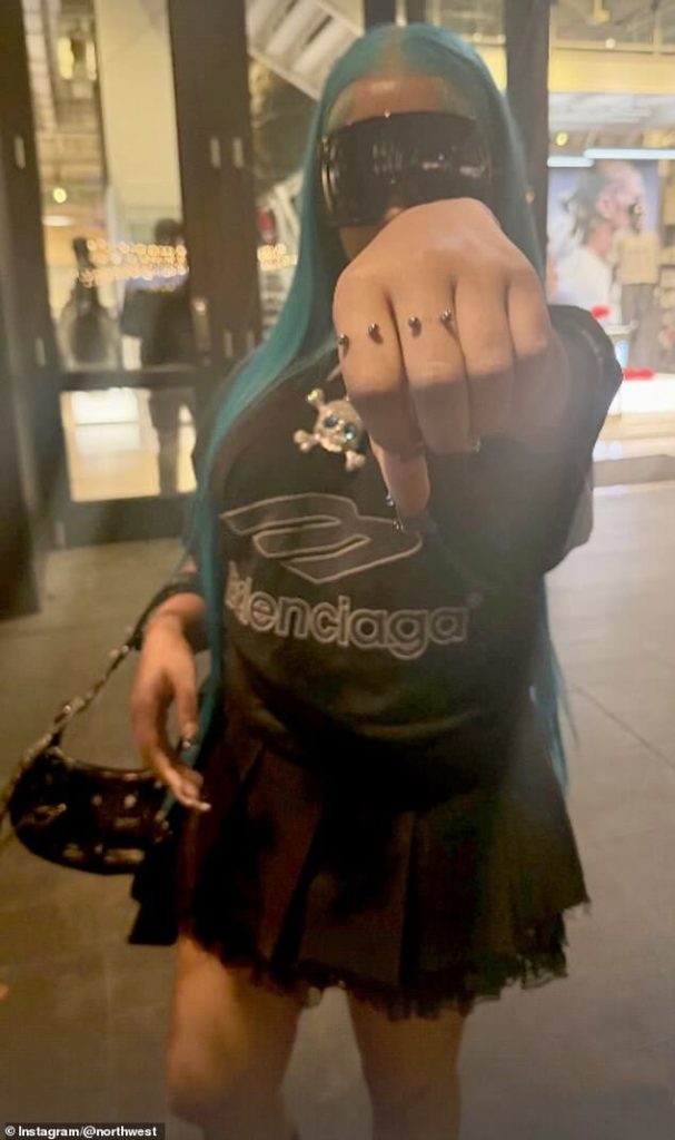 ‘All my friends are hits, you know I’m not lazy/You’re so angry that I’m so mainstream. I’m not sure I’m crazy/I want more piercings and tats/I love blue hair put it in some plaits/Put the music to the max/I want like a hundred thousand racks,’ raps North, who posted the clip on sister Chicago’s 8th birthday.