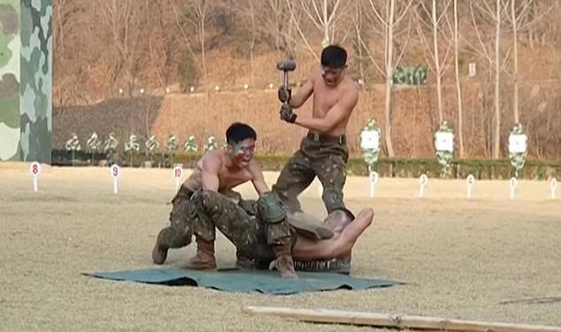 North Korean leader Kim Jong Un watched on with a smile as troops broke bricks with their heads and were hit in the stomach with spades and mallets.